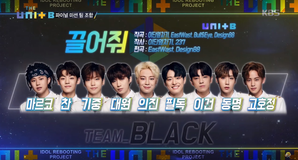 UNIT B Team Black ‘끌어줘’, UNIT G Team White ‘Ting’, UNIT B Team Blue ‘Dancing with the Devil’, UNIT G Team Red ‘You & I’.